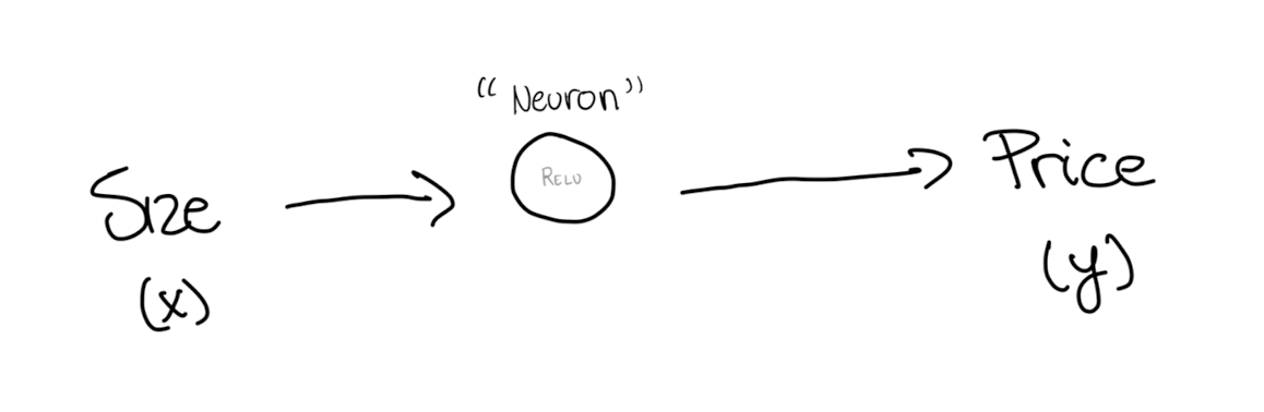 All the neuron does is taking the size of the house as input, apply a transformation equation called ReLU and the output is the estimated the price.
